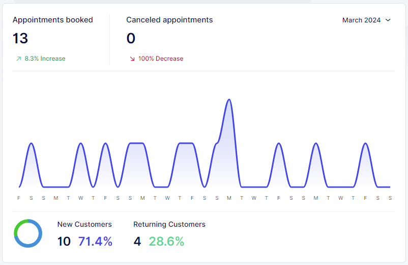 In the “Appointments” section, you can monitor the number of appointments for the current year or since you registered with Appointr. This section displays the total number of appointments, along with the percentage increase (green) or decrease (red) compared to the previous period. Similarly, it provides statistics on the number of cancelled appointments. At the bottom of the graph, you’ll find user-related data, such as the count of new versus recurring users and the percentage they each contribute to the total number of users who booked appointments in the selected timeframe.