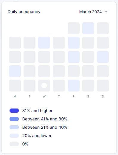 In the “Daily Occupancy” section, you can track the occupancy rate for each day of the month. Similar to the total occupancy, it calculates the number of hours booked for appointments divided by the total number of working hours for all employees on that specific day. Various occupancy rates are represented by different shades, and a scale explains which shade corresponds to which percentage. Clicking on any day in this section will display the exact occupancy rate for that specific day.