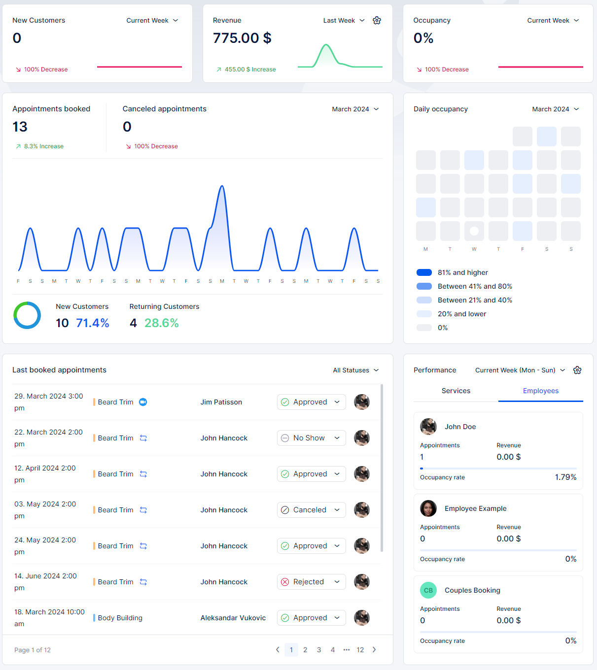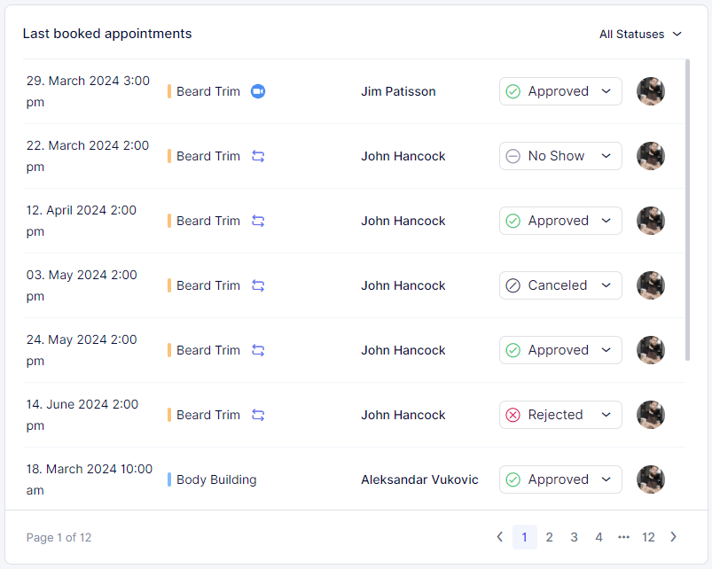 In the “Last Booked Appointments” section, you’ll find a comprehensive list of all appointments, displaying essential details for each appointment such as date & time, service, employee, and customer. The list is organized with the latest booked appointment appearing at the top and descending to the earliest appointment at the bottom. You can filter the appointments shown in the list by their status, allowing you to view approved, pending, cancelled, rejected, no-show, or all appointments.