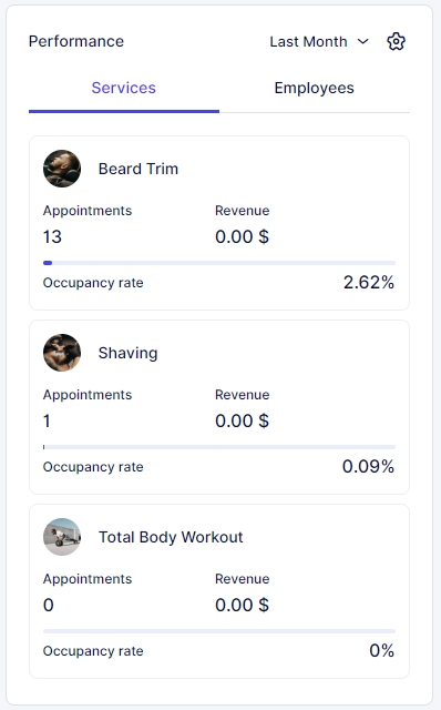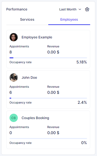 The “Performance” section features tabs for “Employees” and “Services”. In both tabs, you’ll find the top three employees or services with the highest or lowest occupancy rates, based on your sorting preference (most or least occupied). For each employee or service, you can view their occupancy rate, the number of appointments, and the revenue they’ve generated. This data is specific to the selected period from the period picker at the top right of the section.