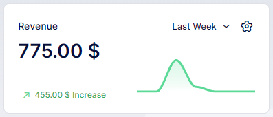 In the “Revenue” section, you’ll find the total income received within the selected time frame from the period picker. Clicking on the gear symbol, you have the option to view the total from paid transactions, pending payments, or both combined. Additionally, a graph illustrates the change in revenue over the chosen period.