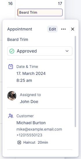 Clicking on an appointment in the calendar will open a popup through which you can click on the “Edit” button and edit the appointment. Clicking on the three-dots menu will provide you with the options to duplicate or delete the appointment, while the card itself expands below these two options, providing more details: