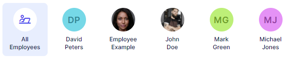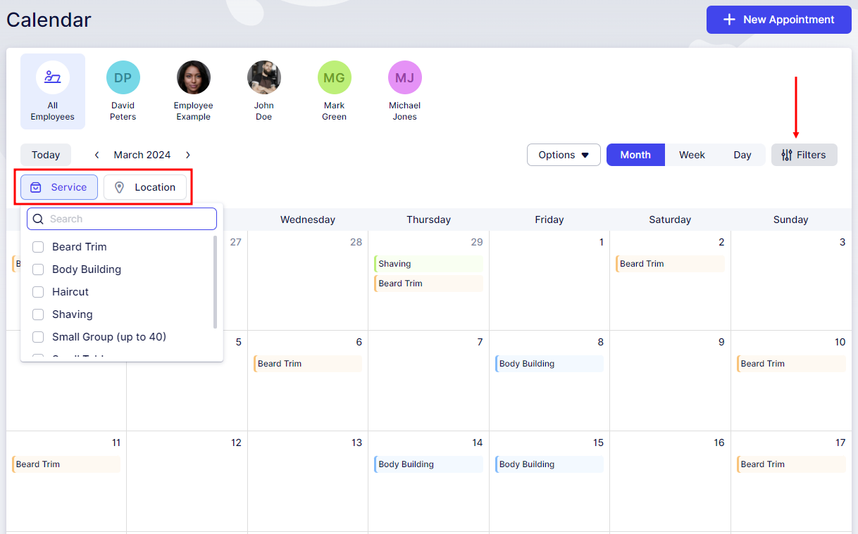On the Calendar page, you can monitor scheduled appointments for each or all employees in a monthly, weekly, or daily calendar view. By default, all employees’ appointments are displayed, but you can easily filter to view appointments assigned to a specific employee, or a certain number of employees by clicking on their picture(s) at the top of the calendar.