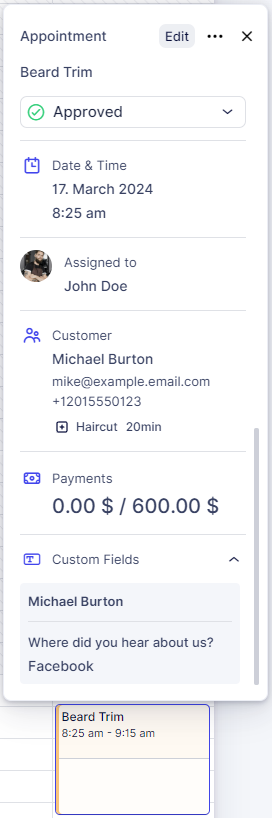 When viewing an appointment card on the calendar, you’ll see the customer’s full name, the service name, and the start and end times of the appointment, including any additional extras and the selected duration.