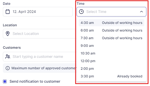 During the creation of an appointment through the back end, the “Time” dropdown will display notifications next to time slots that are already booked or outside of the employee’s working hours.