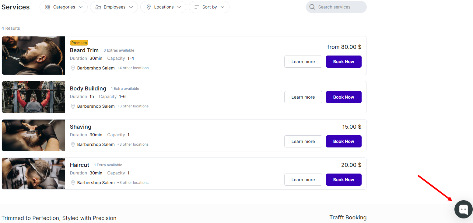 Once saved, the Chat Widget will be embedded into your booking website, allowing customers to easily reach out for support while booking appointments.