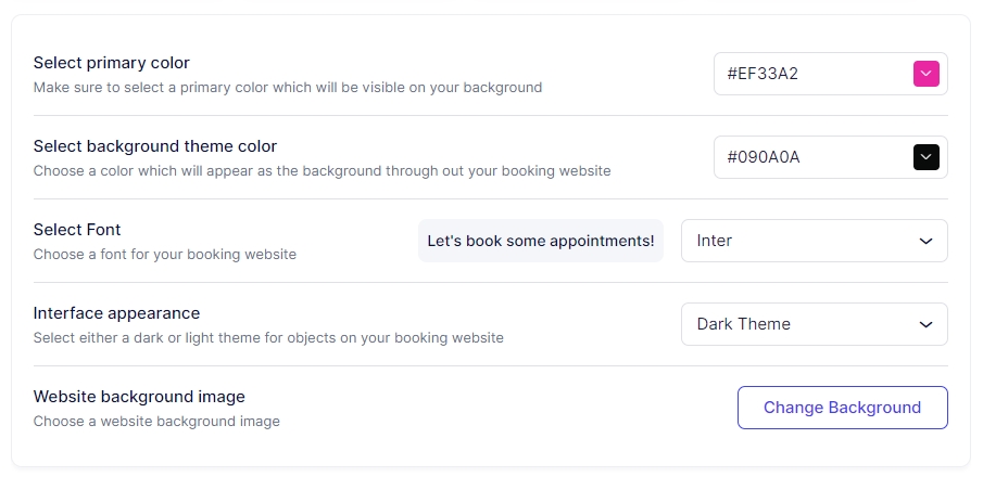 Interface Appearance: This option lets you choose the theme for objects on your booking website, such as service cards and single service page background. Opt for the light option for a lighter appearance or the dark option for a black appearance.