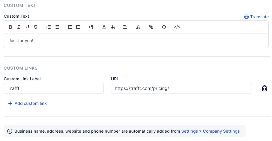 The last two sections allow you to add Custom Text and Custom Links that may be useful for your customers’ user experience.