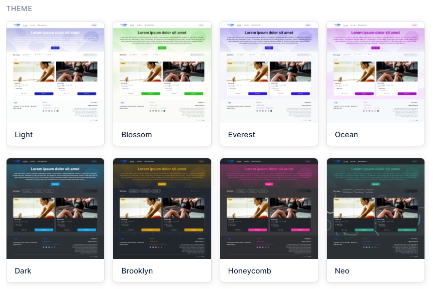 In the “Theme and Appearance” section, you have the option to select from 8 pre-defined themes, available in both Light and Dark versions for your booking website.