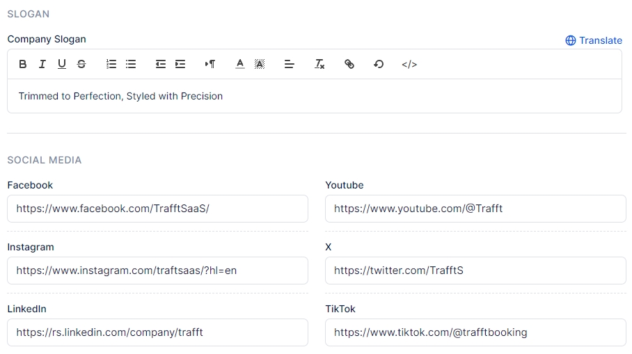 If enabled, the company Slogan, followed by links to your company’s Social Media (Facebook, YouTube, Instagram, X, LinkedIn, and TikTok) profiles will appear next. Here, you can define the slogan of your company and add links to the social media pages.