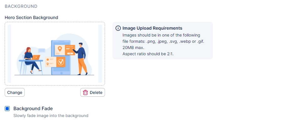 To add an image to your Hero Section, scroll down to the “Hero Section Background” section. Here, you can also apply a background fade effect.