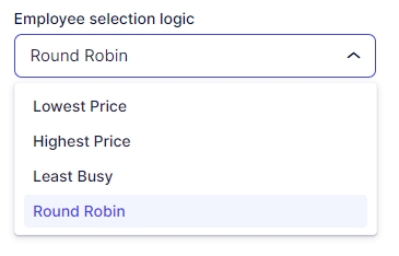 If a customer opts for the “Any Employee” choice on the booking website or neglects to choose a specific employee, you can define the logic for assigning an employee under the “Employee selection logic” dropdown. You have several options to choose from, including Round Robin, which assigns employees in a circular order, as well as options based on the Least Busy employee, the employee with the Highest or Lowest price.