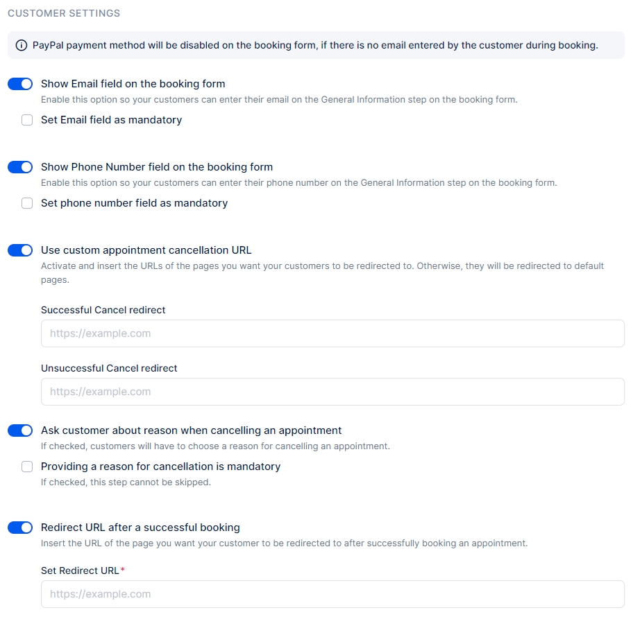 Redirect URL after a successful booking: Similar to the “Cancelation Redirect” URLs mentioned earlier, this setting allows you to specify a custom page for customers to be directed to after successfully booking an appointment. This page can include a personalized message or information relevant to the booking.