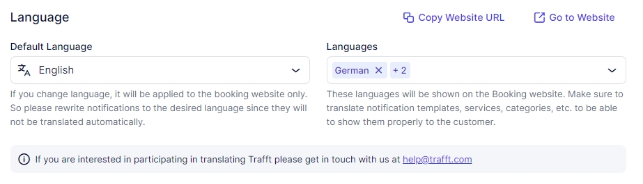 With Multilingual Support enabled, you can configure the default website language and add additional languages for customers to choose from the language drop-down menu on the booking website.