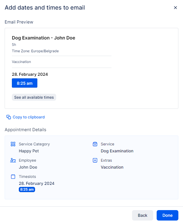 If you choose the Email option, once you configure the booking parameters, you will see an email draft that you can copy using the “Copy to clipboard” option.