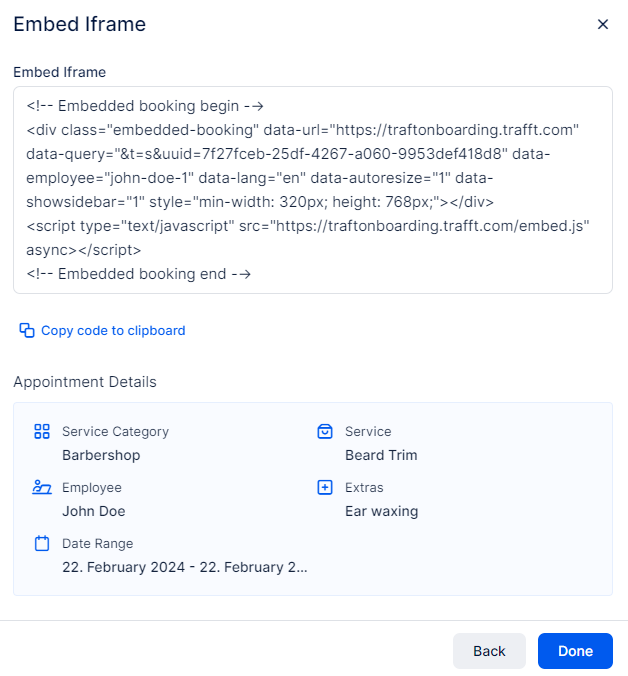 Selecting these parameters is the same as for the Share Link option, so after you define the parameters, Appointr will provide you with the iframe (embed code) that you can copy and paste on another website. The “Copy code to clipboard” option below the code saves you time so you don’t have to select the code with your mouse and copy it.