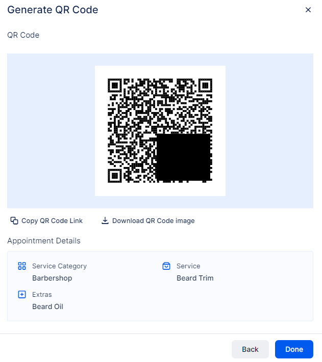 Get a QR code immediately – this option creates a QR code that functions in the same way as your Booking website, so your customers will go through the entire booking process to make an appointment.