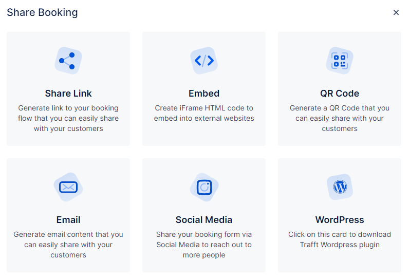 Clicking the “WordPress” card within the “Share Booking” popup modal will automatically download the zipped installation file for Appointr's WordPress plugin.