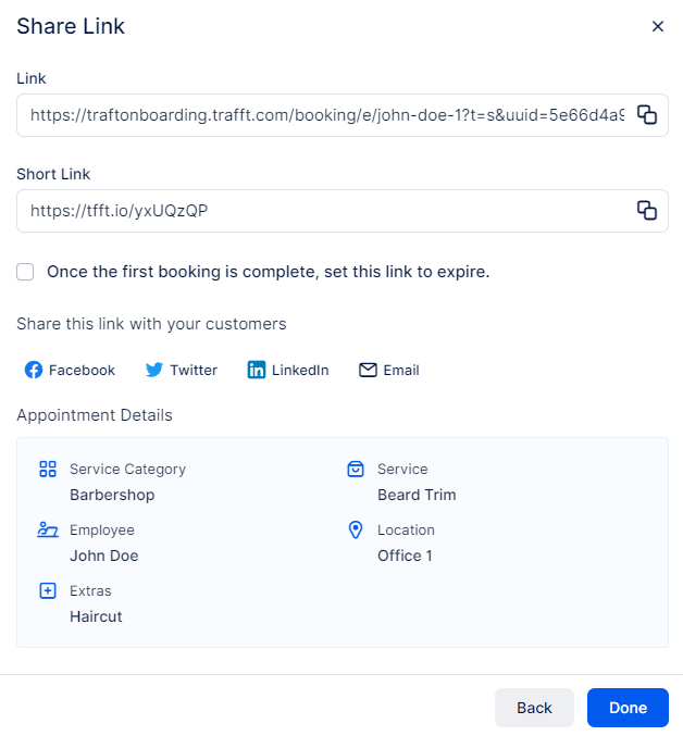 Appointr doesn’t save the generated links, so make sure to copy them before closing the modal.