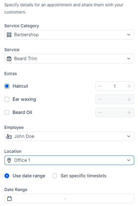 The Use Date Range option allows you to select a single date (by double-clicking the date) or a range of dates when you will offer appointments, while the Set specific timeslots option allows you to select multiple timeslots (you can select a single date with multiple timeslots, or you can select multiple dates with different timeslots).