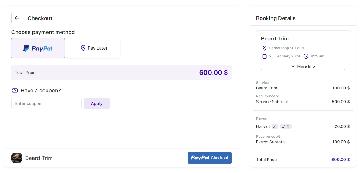 In the “Checkout” step, the payment methods you’ve defined for this service in the Service Settings will be presented to the customer. They can then choose their preferred method of payment from the options available.