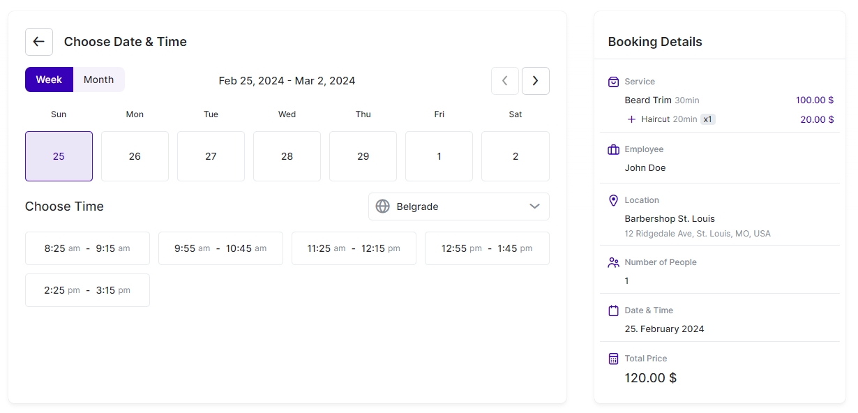 In this example, it’s the Date & Time selection. By default, the first available week when the selected employee is available is shown, and below it, the available times for the selected date are displayed. Your customers can cycle through weeks by using the < and > arrows for navigation above the dates. Additionally, they can switch to the Monthly view if they need to select a date further in the future.