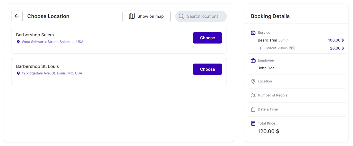 If you have multiple physical locations, you can define their addresses in the “Locations” section within the back-end. Google Maps integration is available to assist you in selecting the correct location. Once these locations are configured, customers visiting your booking website will be able to select their preferred location for their appointment. Clicking on “Choose” allows customers to select the location and proceed to the next step in the booking process.