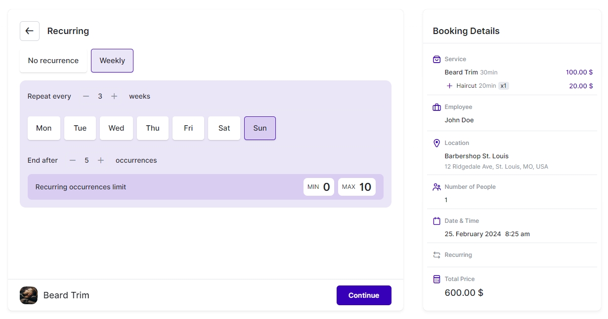 Once the customer clicks on a time slot, it will automatically be selected, and the form will proceed to the next step. If you have configured the Recurring Appointments feature, this will be the next step in the process. This feature allows customers to set up regular appointments with ease. You can define how many appointments the customer can book in a recurring cycle, how they will recur (daily, weekly, or monthly), and in what intervals (once a week, once every 3 weeks, once every 2 months, etc).