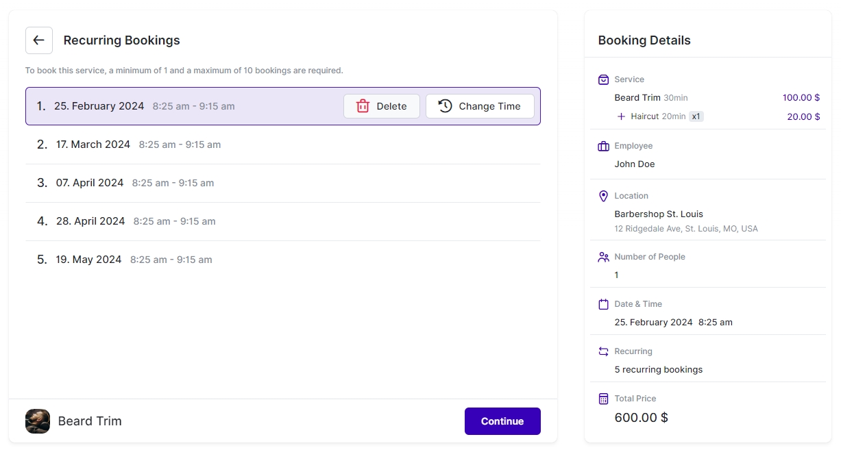 Clicking on “Continue” provides customers with a list of all their appointments, including the first one and all the following recurring appointments. If any time slots are already filled by other appointments or if the exact date of a recurring appointment is blocked by a linked Calendar or Day Off setting, Appointr will automatically move the appointment to another available time or date based on your configuration in the Service Settings for Recurring Appointments.