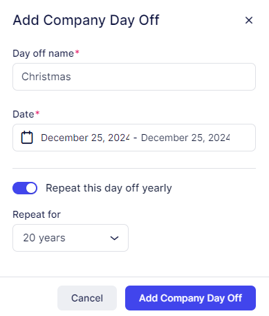 In the popup that appears, define the name of the day off, specify a single date by double-clicking the date or a date range by selecting the start and end dates. You can also choose whether the day off will be repeated every year. If you enable the option for the day off to repeat, you can select how many years it will repeat, ranging from 1 to 20 years.