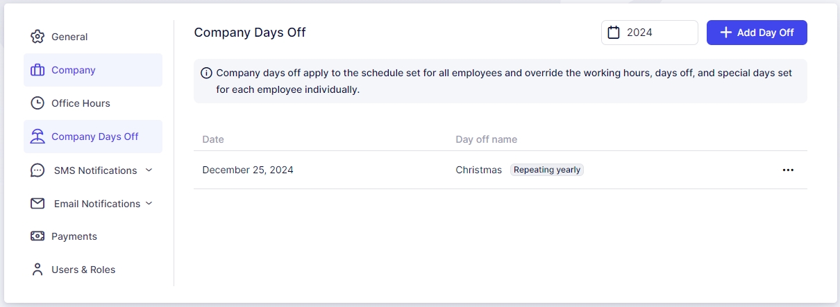 For instance, let’s say your business will be closed for a national holiday on December 25th. You can mark this day as a Company Day Off, which will automatically block the entire day from being available for appointments. This prevents any bookings on that day.