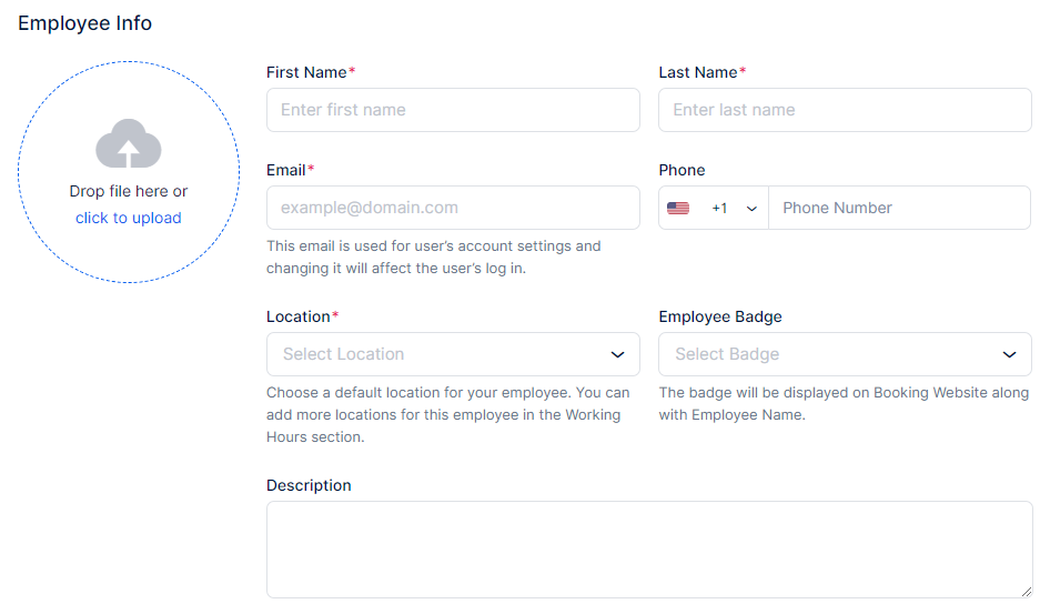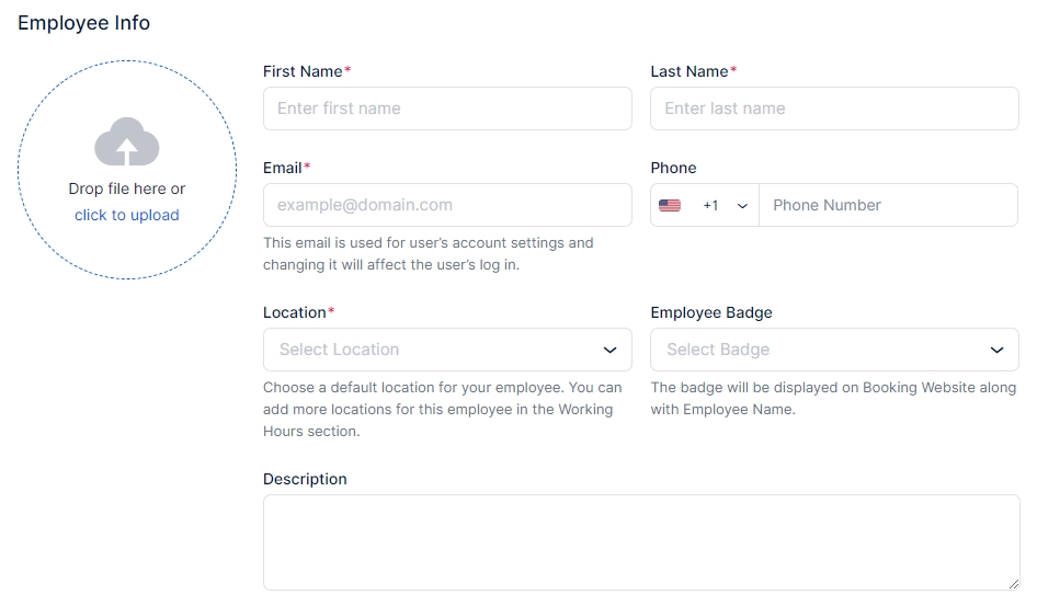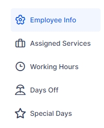 Profile Image: Upload an image to help identify the employee in the Calendar, Employees, and Appointments pages. This provides customers with a visual during their booking process, making it easier to recognize the employee.