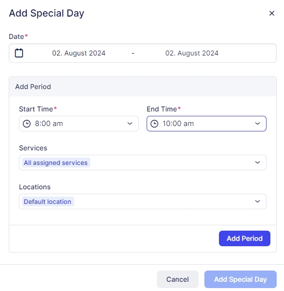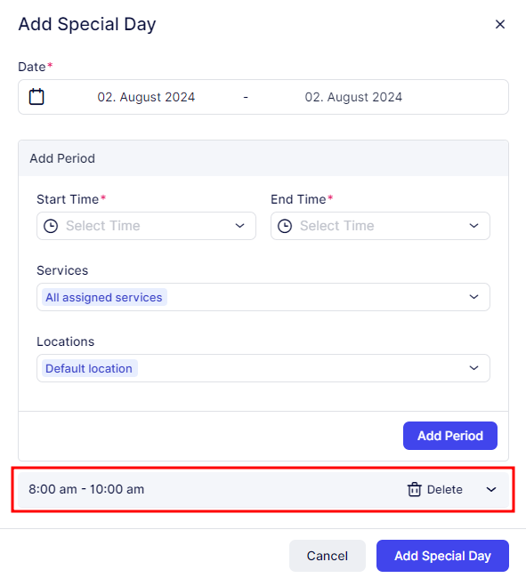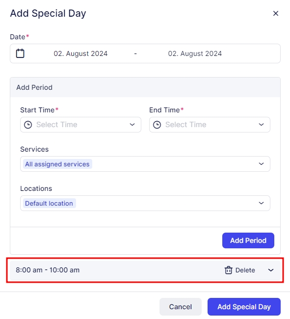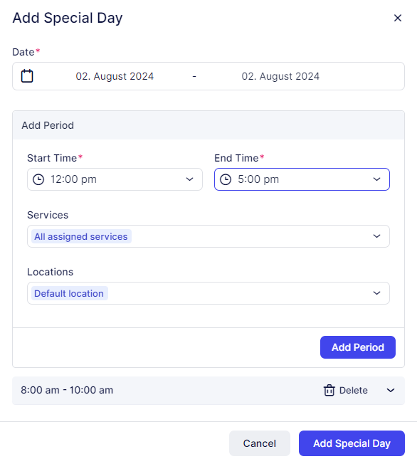 After adding the first period, such as 08:00 – 10:00, proceed to add the next period, like 12:00 – 17:00. Click on “Add Period” again if there are additional time slots needed. Once all the necessary periods are added, click on “Add Special Day” to save the entire schedule. It’s crucial to remember to click “Add Period” for each new time slot; otherwise, the Special Day will be saved with only the first period included