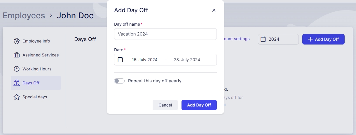 The “Days Off” section is where you can easily manage your employees’ time off, whether it’s for vacations, holidays, or sick days.