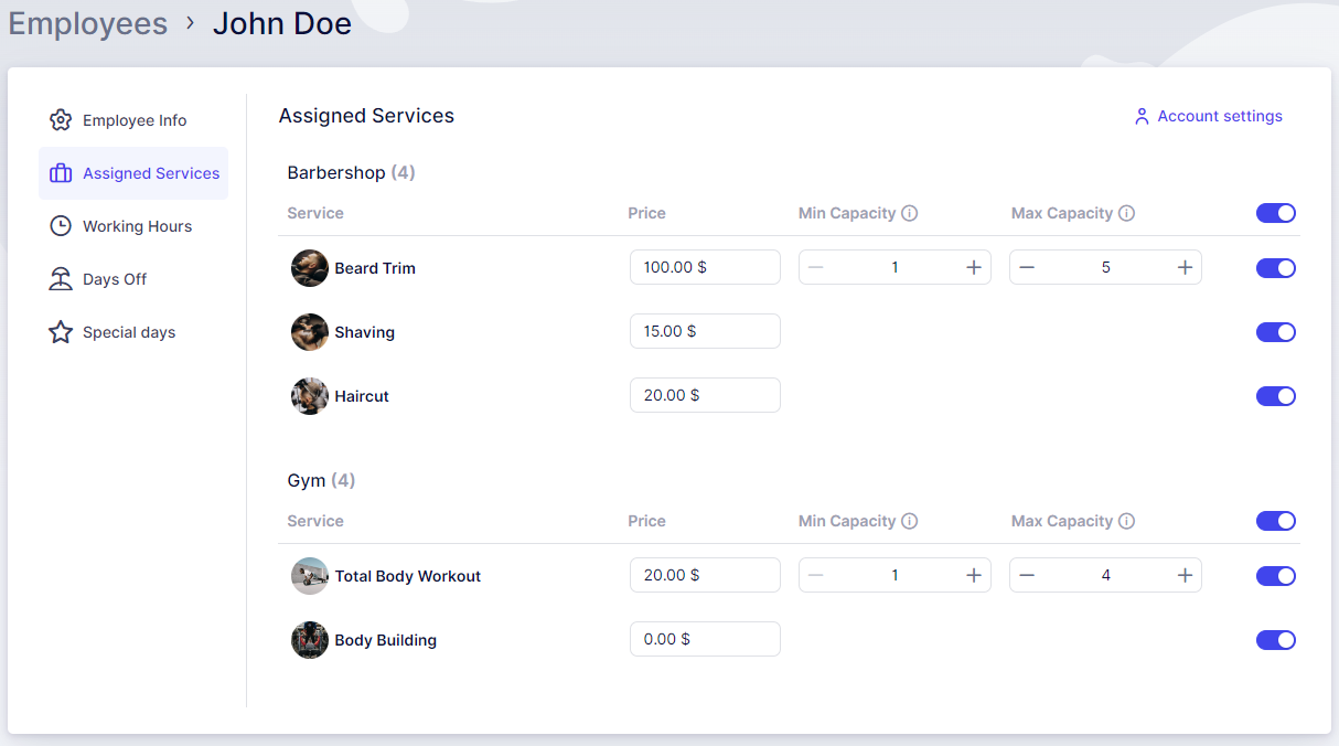In the “Assigned Services” tab, you can manage which Categories and Services the employee will provide by enabling or disabling them. Once services are assigned to the employee, you can configure different prices for those services specific to that employee, as well as set different minimum and maximum capacities.