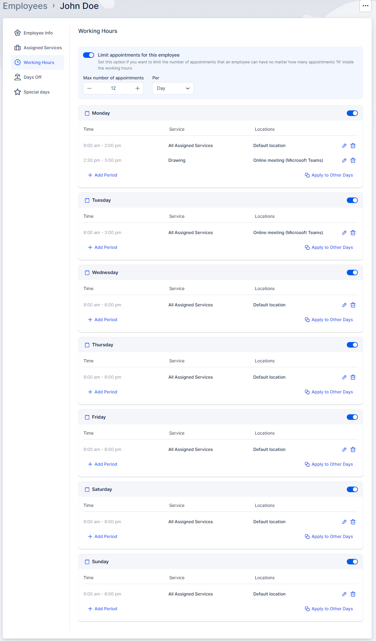 This section enables you to configure your employee’s working schedule, which can be a fixed schedule throughout the week or one that varies based on services and/or locations.