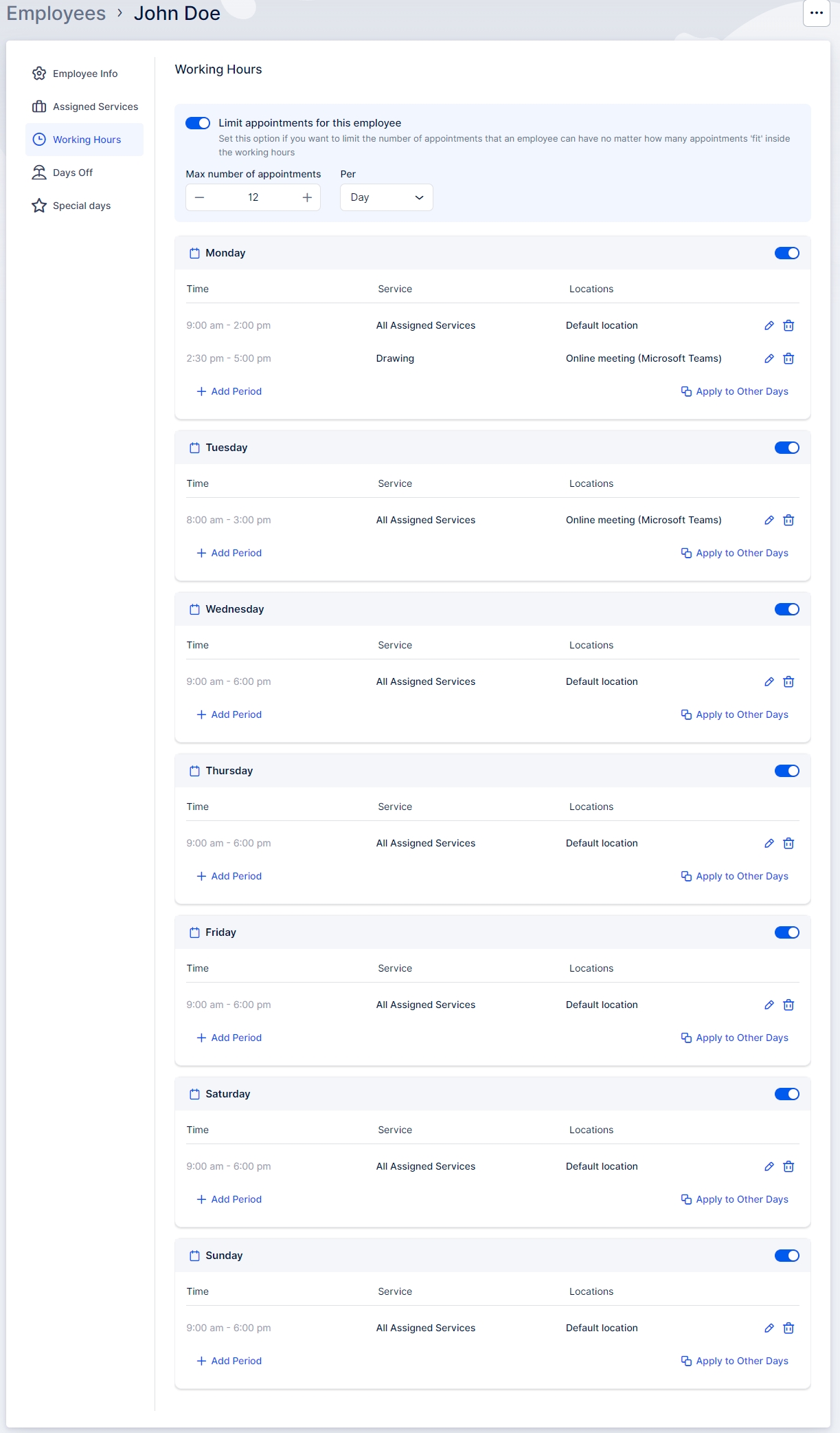 At the top of this page, you can also set limits on the number of appointments the employee can have per day, week, or month. These limits will override the available time slots in the employee’s schedule.