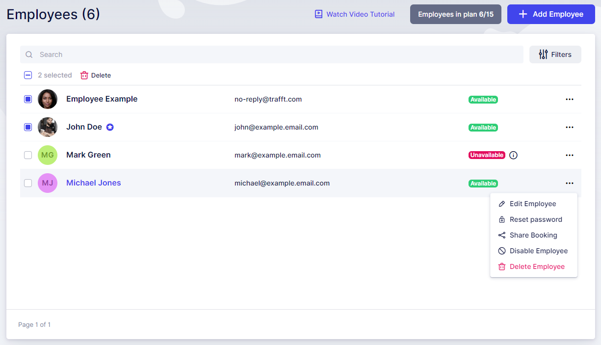On the Employees page, you’ll find a comprehensive list of all your employees along with their essential details such as photos, names, emails, and phones. If you have numerous employees spread across multiple pages, you can efficiently search for employees by name or utilize the Filters option to search by Services or Locations they are assigned to.