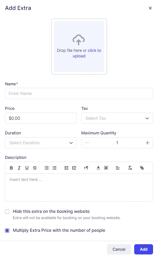 Multiply Extra with the Number of People: Select this option if the price of the extra should be multiplied by the number of people booking the service (applicable for Group services).