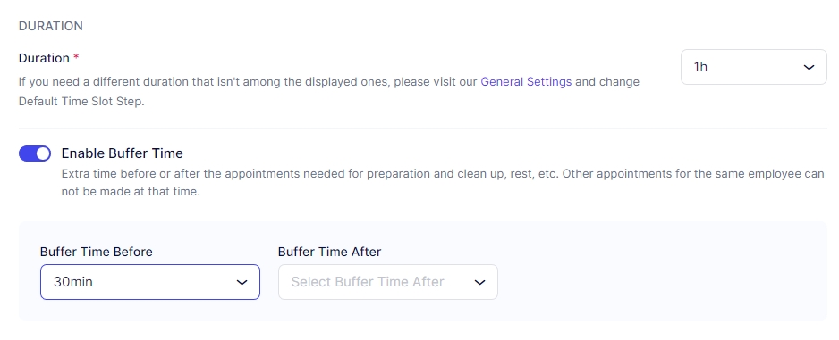 Duration: Define the duration of the service. The available time slots will depend on the Default Time Slot Step set in the General Settings. If the desired time frame isn’t available, you can adjust the Default Time Slot Step in the General Settings.