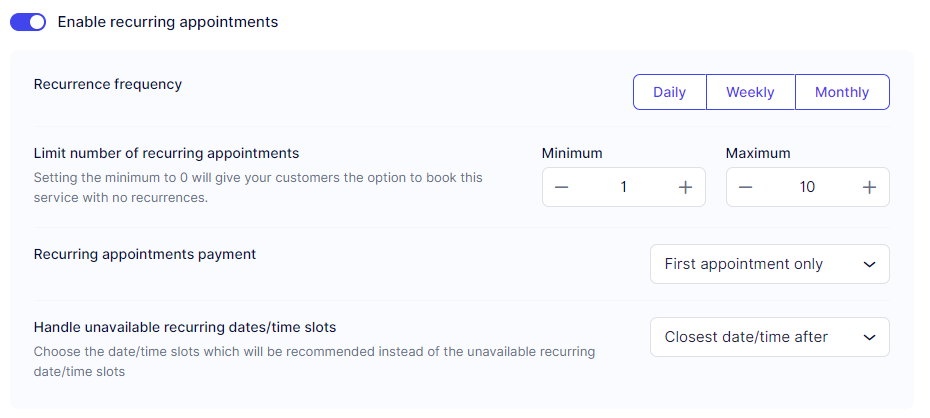 Enable recurring appointments – Enabling this option allows you to configure this service for recurring bookings. Once enabled, you can choose the frequency (daily, weekly, monthly), set the minimum and maximum number of recurring appointments a customer can choose, configure how the recurring appointments will be paid for, and select how non-available recurring dates/times will be handled.