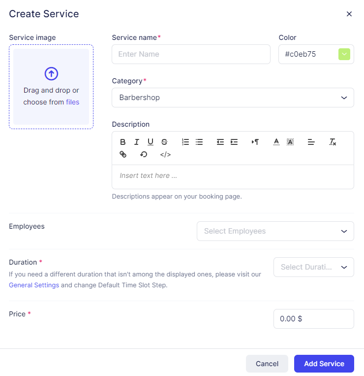 In this modal for creating a new service, you can configure the details for the service that you’ll offer to your customers on the Booking Website: