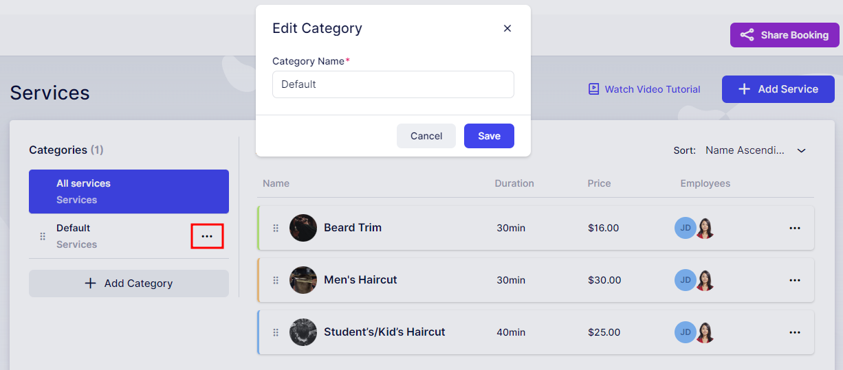 When your account was created, Appointr automatically generated some dummy services and placed them in the Default Category. This category is created to ensure you have a starting point. While this category cannot be deleted, you can easily rename it by clicking on the three-dots menu on the Category bar and selecting the “Edit Category” option.