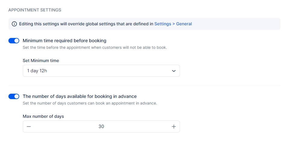 For example, if the minimum time required before booking for all services is 1 day, you might want to adjust a specific service to require 7 days’ notice or any other time frame that fits your requirements.