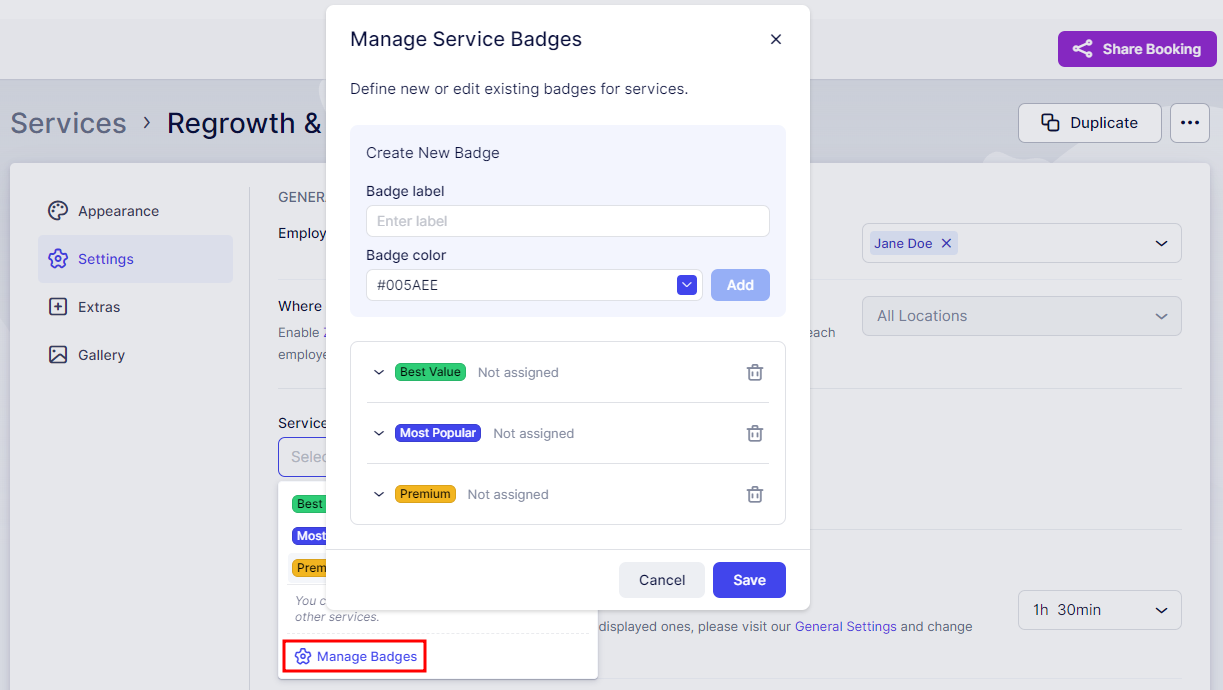 Service Badge: This is a badge that can be assigned to the service to highlight it to your customers. When you expand the drop-down menu, you will see default badges already added to the account (such as Best Value, Most Popular, and Premium). Clicking on “Manage Badges” allows you to edit or delete existing badges and add new ones. These badges can be useful for highlighting special features or promotions for your services.