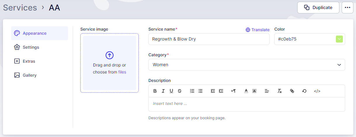 Service image: Upload the main service photo here. This image will be displayed on the Services page in the admin dashboard and on the Booking Website to visually distinguish the services. Click anywhere in the square to choose a photo from your files and upload it, or simply drag and drop a photo into the square.