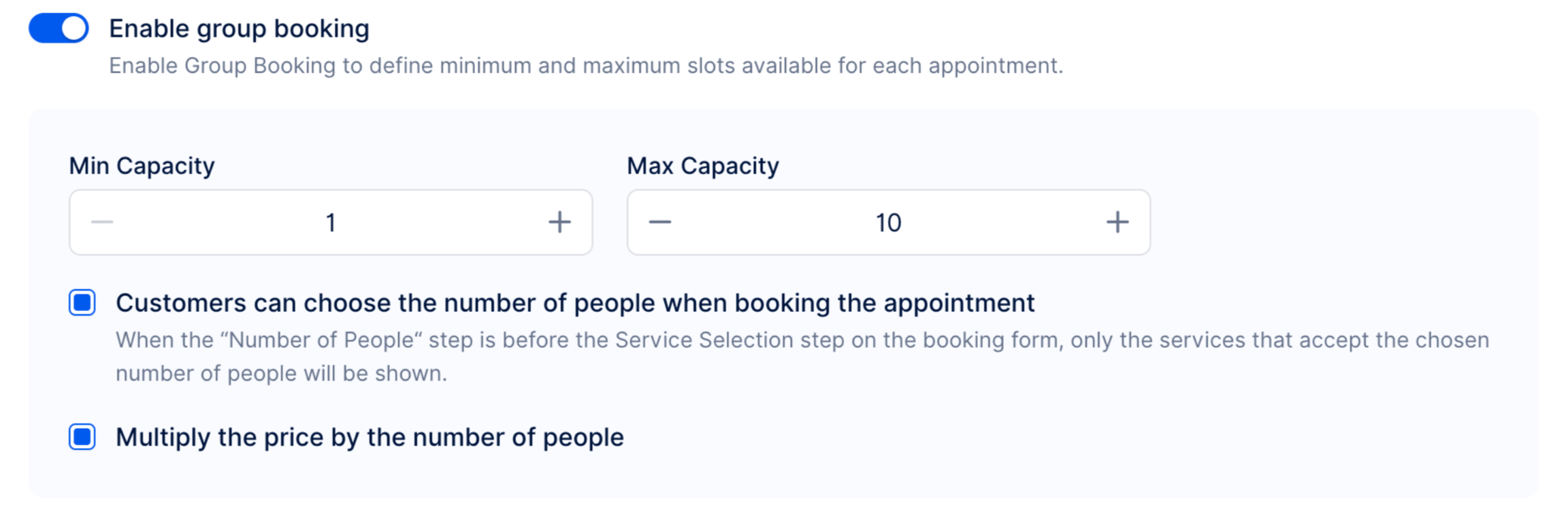 Enable group booking – Enabling this option reveals two additional settings: Min Capacity and Max Capacity. Here, you define the minimum and maximum capacity for the service. By default, both values are set to “1,” meaning appointments can be booked for a single person only, without the option for multiple customers to book the same appointment. Once the Max Capacity is set to any number above 1, two new options will appear:
