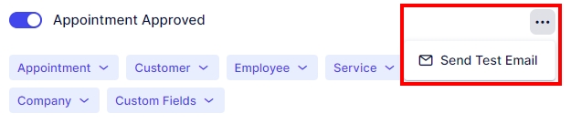 Each email template can be tested to preview what it looks like for your customers. Simply click on the three-dots menu in the top right corner of the template editor, then select “Send Test Email”.