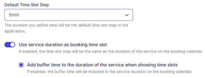 Default Time Slot Step: This setting determines the time increment used throughout the application for various durations, including employee working hours, special days, service durations, and buffer times. By default, it is set to 30 minutes, but you have the flexibility to adjust it according to your needs. It’s crucial to note that all durations in Appointr must be divisible by this number. For example, if you want to offer a service lasting 2 hours with buffer times of 5 minutes, the Default Time Slot Step should be set to “5 minutes”.