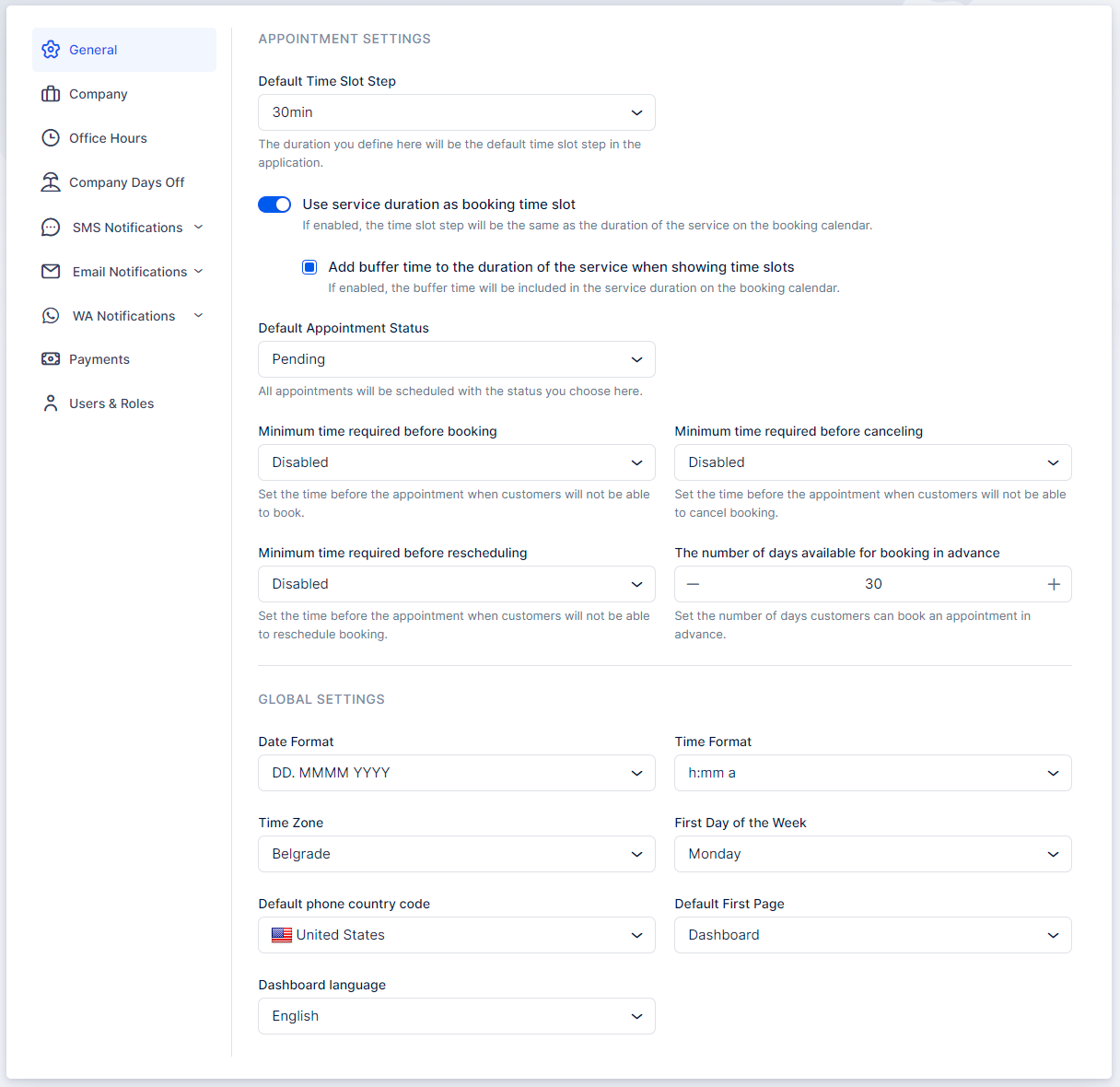 Default Appointment Status: This setting determines the initial status of all appointments when scheduled. By default, it is set to Approved, meaning all appointments will be made with the approved status. When email/SMS/WhatsApp notifications are configured, this status will automatically trigger the “Appointment Approved” notification for both customers and employees. Changing the status to Pending will require all appointments to be manually approved by the site admin/superadmin or the assigned employee.